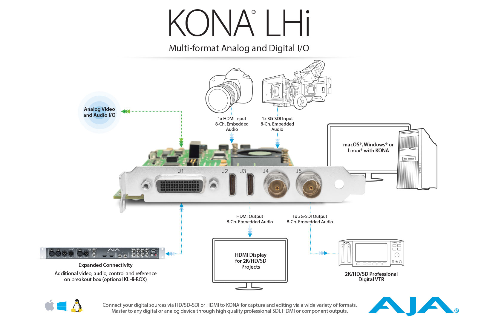 De AJA Kona LHi verbindt eenvoudig met allerlei apparatuur, van HDMI-camera’s tot HD-SDI VTR’s. Hij biedt een scala aan functies zonder compromissen, waaronder ondersteuning voor 10-bits of 8-bits ongecomprimeerde video, 2-kanaals AES digitale audio, 8-kanaals SDI embedded audio, analoge composiet-, S-video- of SD/HD component video I/O, en 2-kanaals gebalanceerde analoge audio I/O.