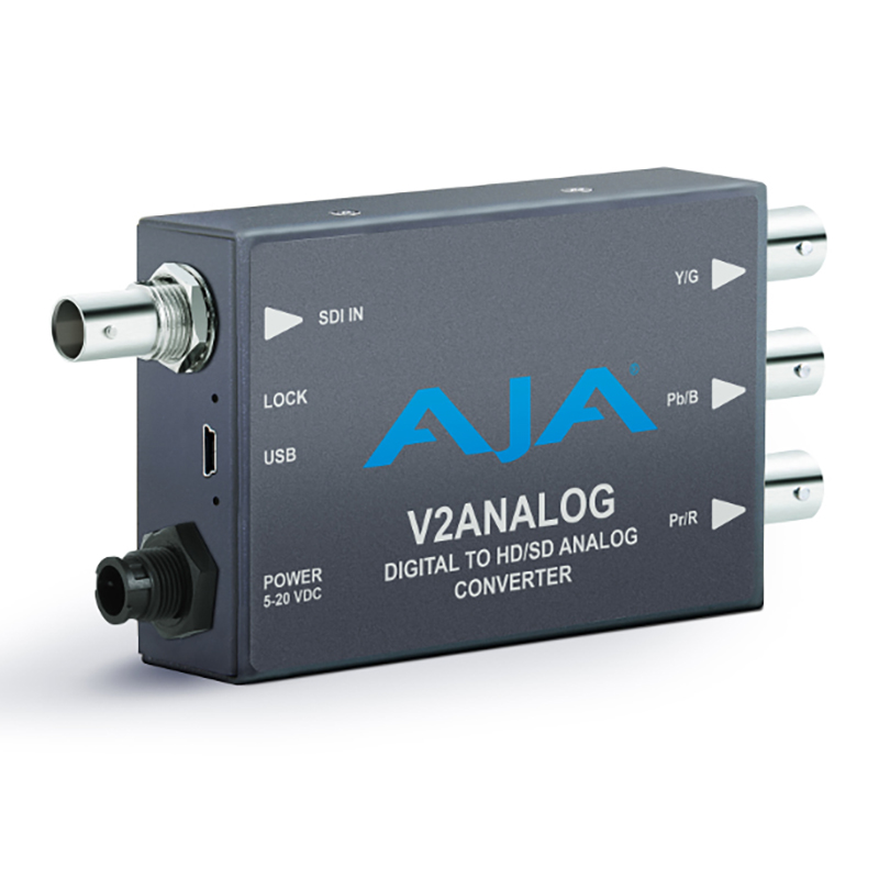 De AJA V2Analog kan binnenkomende SDI-signalen omzetten naar YPbPr (SMPTE, EBU-N10), Betacam of RGB-componentuitgangen, of NTSC/PAL of Y/C (S-Video) composietuitgangen. Hierdoor is de converter volledig integreerbaar in elke workflow.