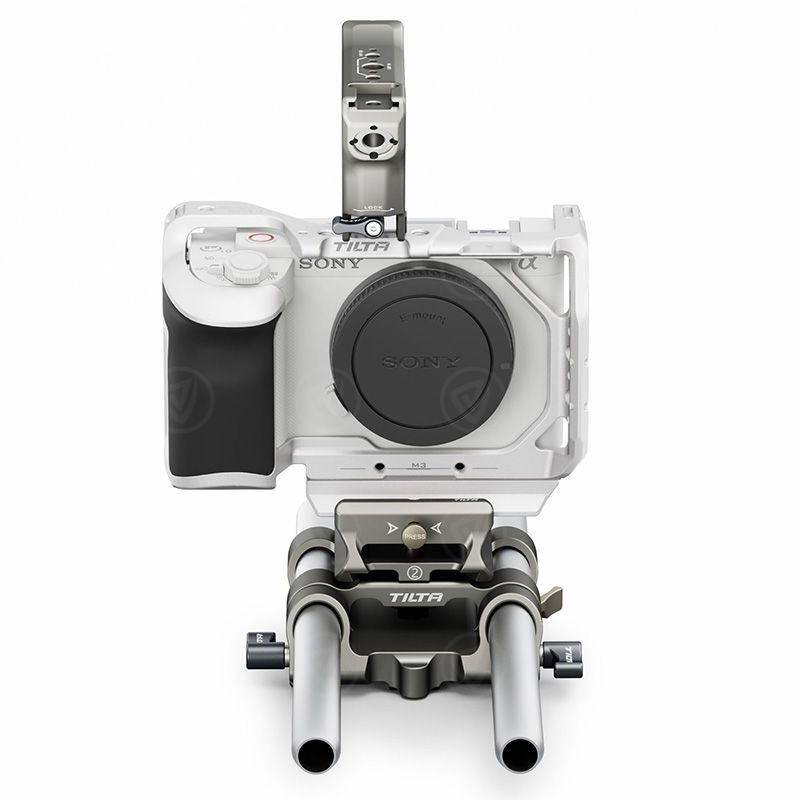 Camera cage kit (gesloten) bestaande uit: Basis camera cage (gesloten), bovengreep met NATO klem, NATO adapter, camera koelsysteem, LWS basisplaat, 2x 15mm rod (lengte: 20,0 cm), met afneembare ARCA-Swiss snelkoppelingsrail, NATO rail, cold shoe, diverse 1/4” schroefdraad, diverse schroefdraad met anti-verdraaibeveiliging, kleur: zilver/titanium grijs, speciaal ontworpen voor Sony ZV-E1