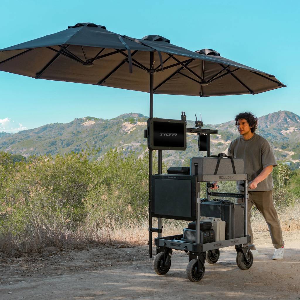 De kit is ontworpen specifiek voor de Boulder Camera Cart-serie, waarbij hij naadloos integreert met de standaard 4 verticale support-posts van de cart en andere Boulder-accessoires. Hierdoor blijft je cart-workflow overzichtelijk zonder extra adapters of ingewikkelde bevestigingssystemen. Wil je maximale zichtcontrole, dan kun je de extended umbrella combineren met optionele Sunshade-panelen. Deze panelen sluiten rondom de luifel en kunnen bijna een blackout-omgeving vormen, ideaal voor video village setups in fel zonlicht.