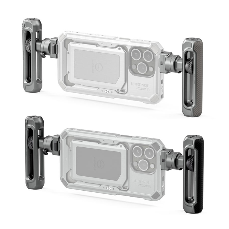 The Khronos Adjustable Handle is a versatile accessory, designed to help enhance your mobile shooting capabilities and experience. This lightweight handle can be quickly attached to your device. This can be done with no tools, ensuring convenience and portability. Its adaptable design fits seamlessly on both sides of your device, featuring an adjustable height range of up to 53mm for the best flexibility and fashioning. You can rotate the handle 90° to use it as a top handle. 5 gear rotation options allow you to find the perfect angle for your needs. The non slip silicone grip and textured surface ensures a secure and comfortable hold while in use. Integrated 1/4 threaded holes at the top and bottom offer expansion possibilities for connecting additional devices, highly advancing your setup.