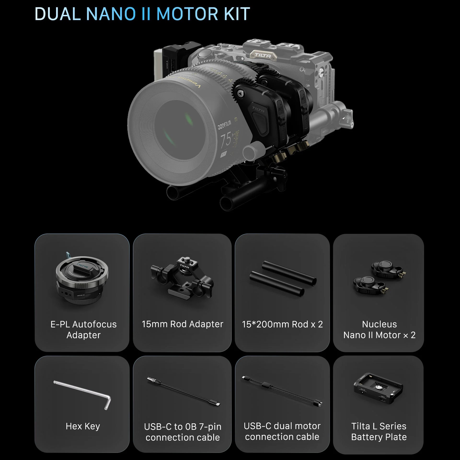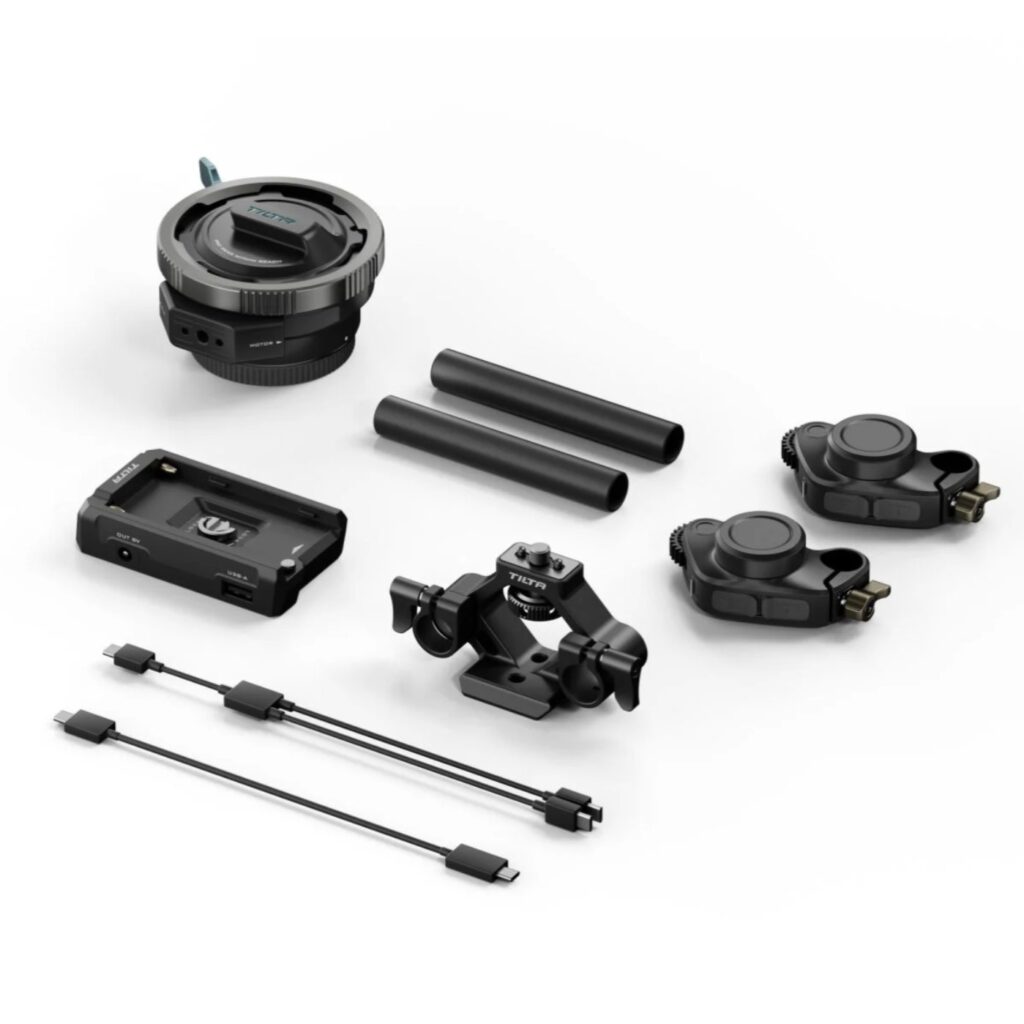 De kit wordt geleverd met twee Nucleus Nano II motors die draadloos samenwerken met het Tilta-ecosysteem. Daarnaast bevat de set essentiële kabels, battery plate V2 voor L-serie accu’s en aansluiting-opties voor side focus handles, waardoor je setup compact en professioneel blijft.