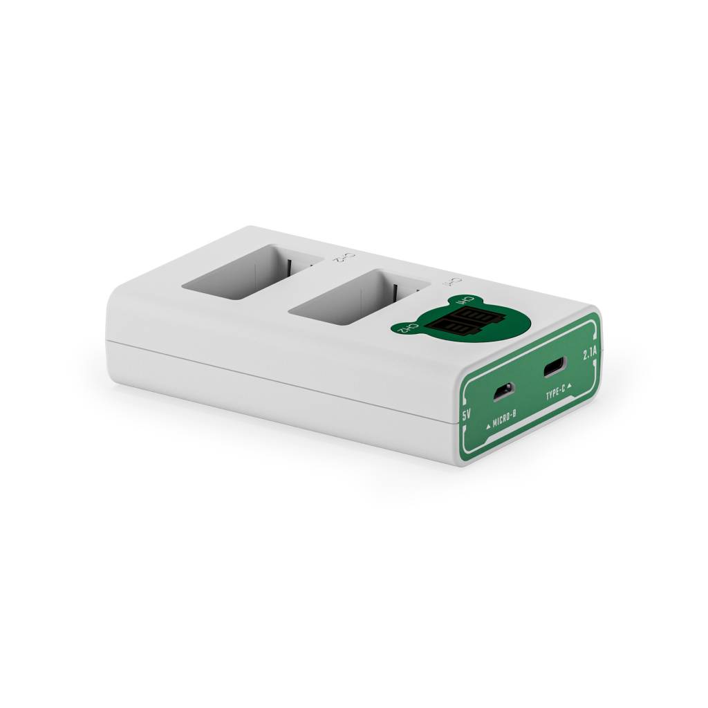 De charger werkt intuïtief: plaats je batterijen in de twee slots en sluit een voeding aan. Het LCD-display toont direct de juiste status, waardoor je niet hoeft te gokken hoe lang het laden duurt. Dankzij de compacte vorm neem je hem gemakkelijk mee in je camera-tas of rugzak. De dual input-opties bieden bovendien flexibiliteit in voeding.
