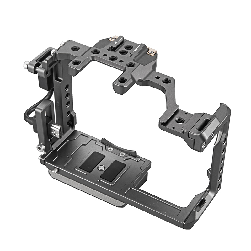 This “full” camera cage provides complete protective armor for the Panasonic GH4, GH5, and GH5S cameras. It provides several 1/4”-20 and 3/8”-16 mounting points as well as two cold shoe mounting points. The base of the cage also provides several mounting holes when attaching your camera to gimbals to more easily fine tune the balance of your setup.