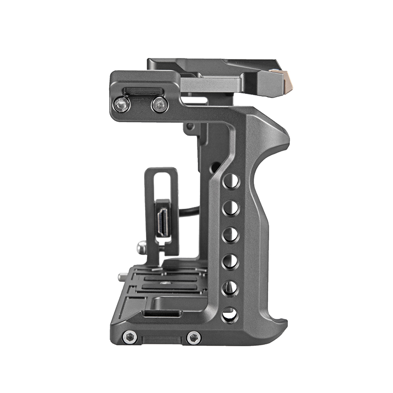The quick release top handle and various optional side handles can be attached to the cage to provide for different ways to comfortably operate your camera setup.