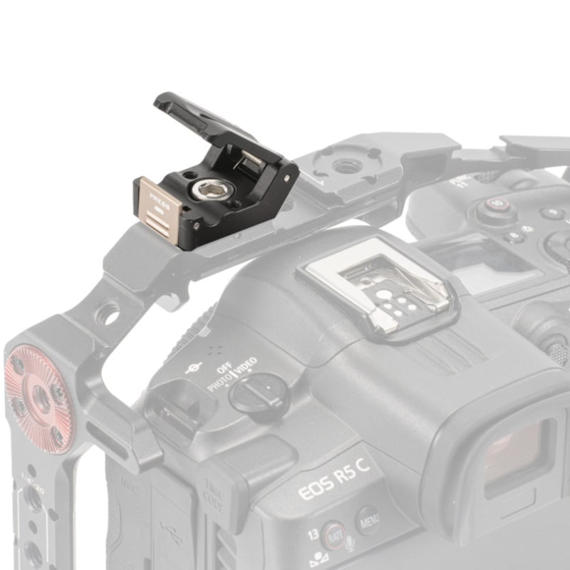 This clamp connects to almost any camera cage with a 1/4″-20 screw with a retractable locating pin that prevents rotation when locating pins are available.