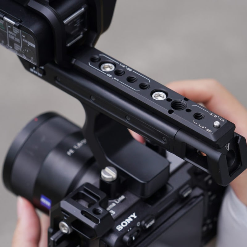 This bracket lets you mount additional accessories thanks to the Cold Shoe, NATO Rail, 1/4″-20 and 3/8″-16 threads with locating points.