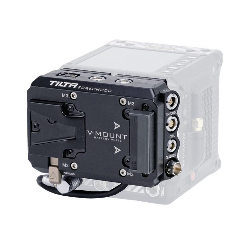 Bij gebruik van V-Mount-batterijen communiceert deze module volledig met de camerabody, zodat de resterende levensduur van de batterij als een percentage te zien is op de gebruikersinterface van de RED Komodo.