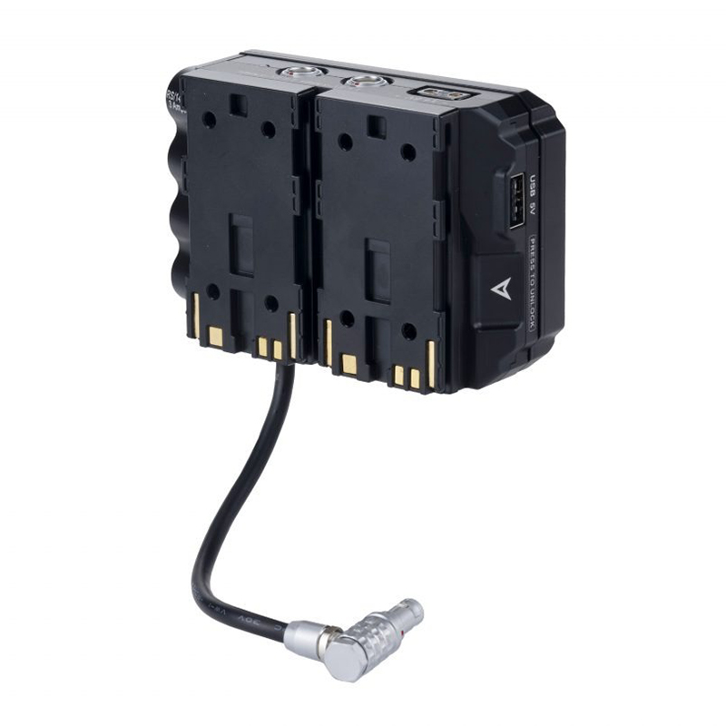 Deze Advanced Power Distribution Module past in de dubbele Canon BP-batterijsleuven van de RED Komodo. Zodat een V-Mount Battery horizontaal geplaatst kan worden.